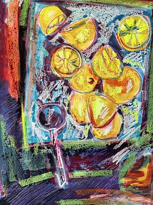 Cutting board still life - Oil pastel painted under gouache watercolor pigments
